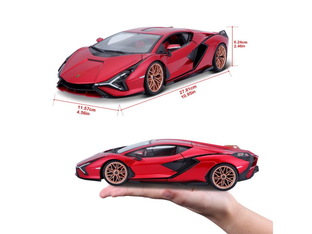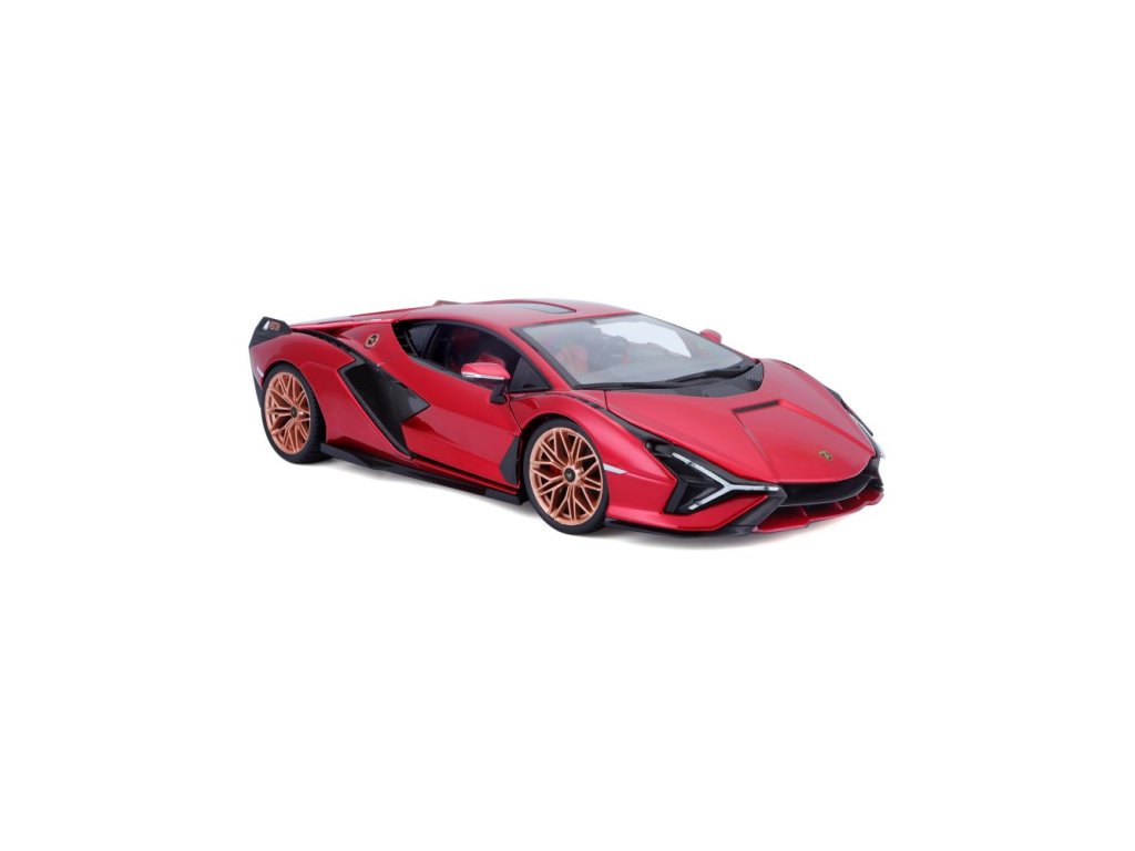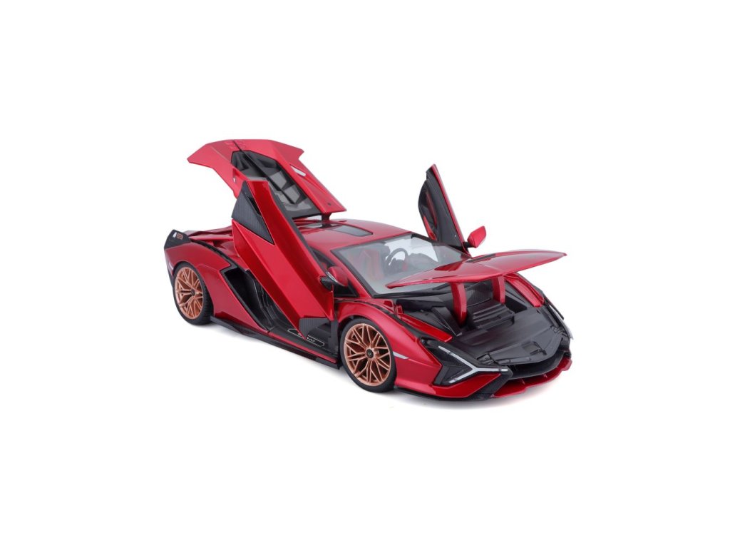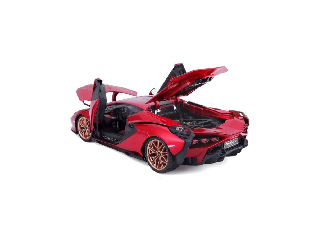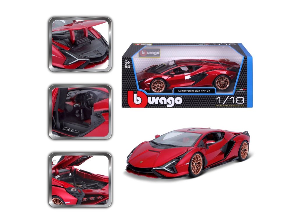 Kovový model auta Bburago BB11046R Lamborghini Sián FKP 37 nejen pro sběratele v měřítku 1:18. Má otevírací dveře a kapotu, natáčení kol volantem je plně funkční.