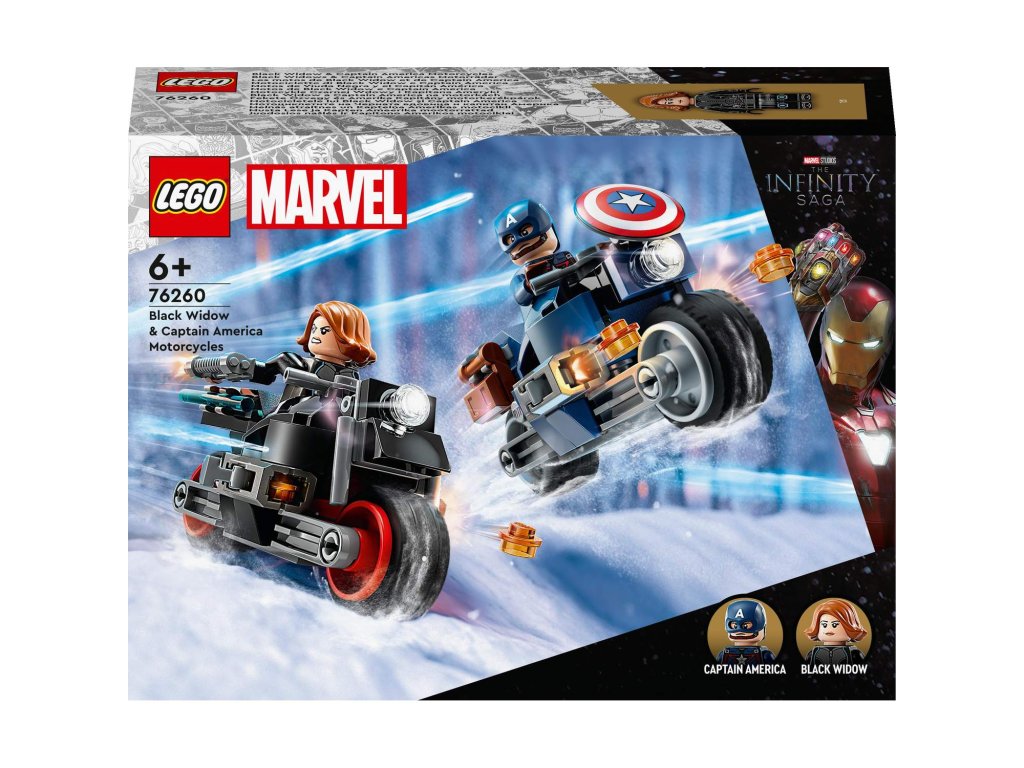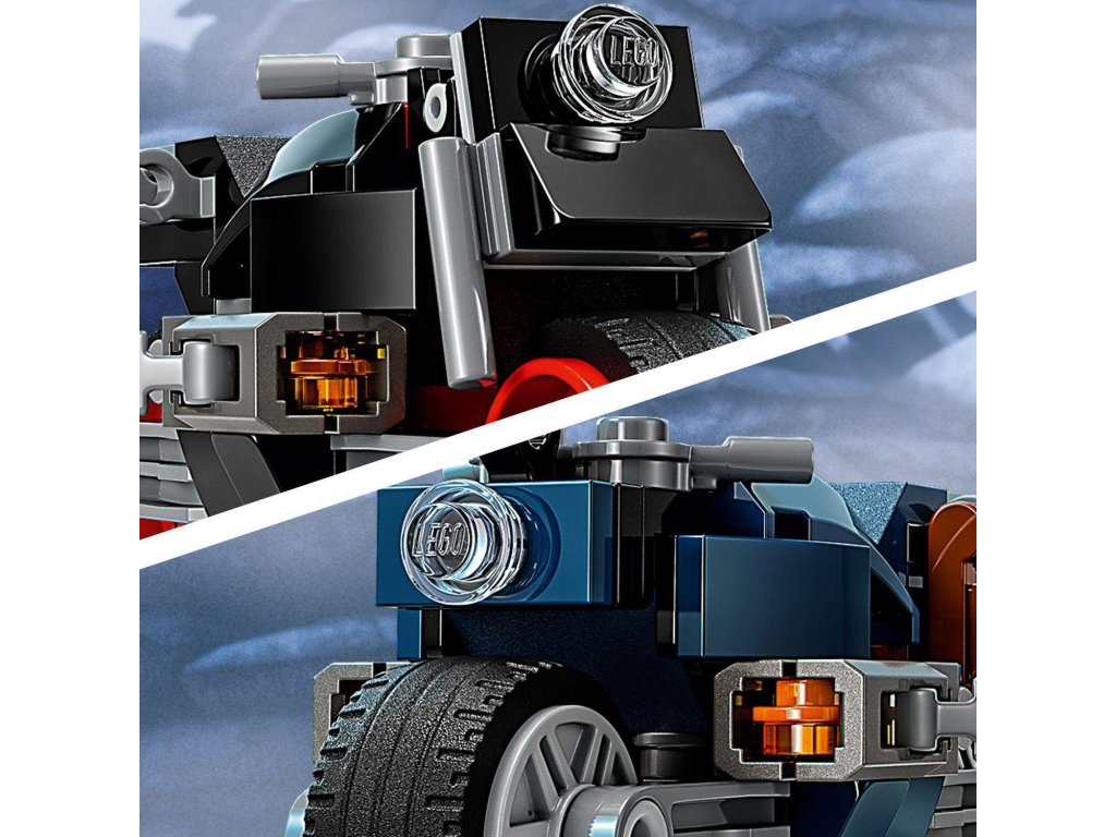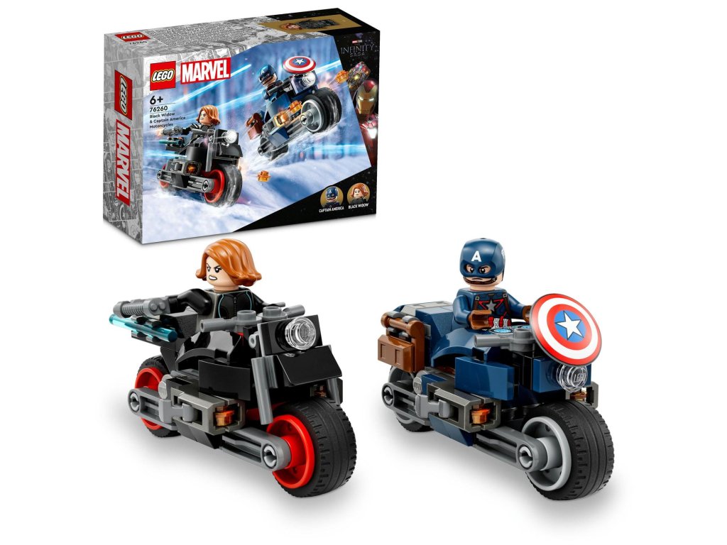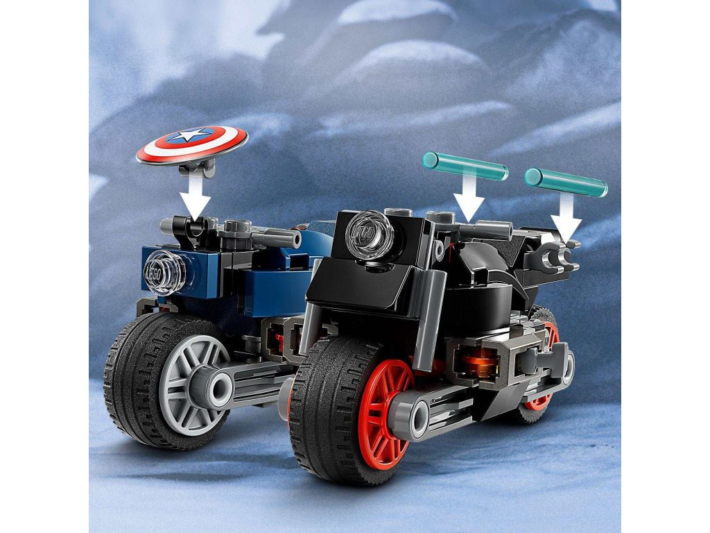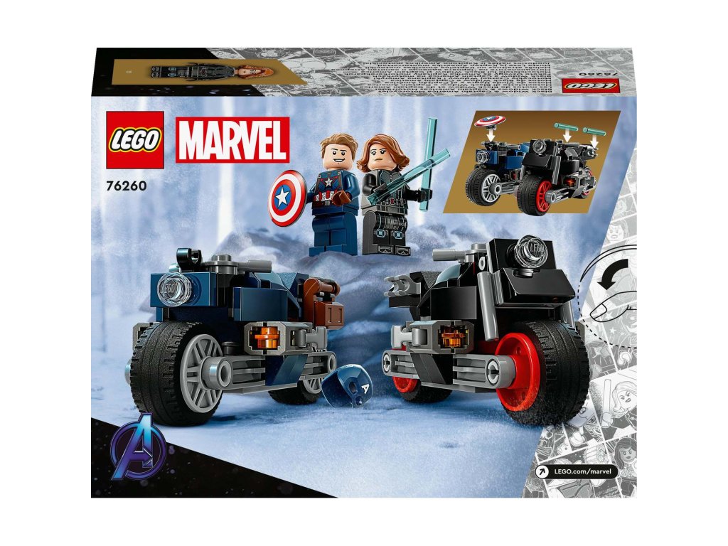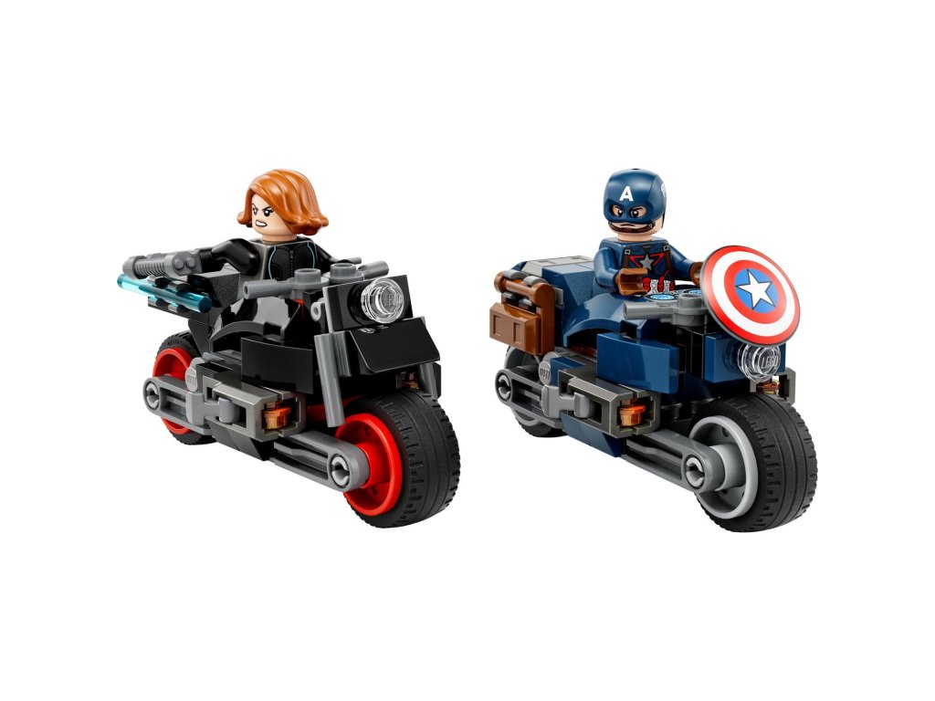 Minifigurky Captain America a Black Widow sedí na motorkách, které se poprvé objevily v nezapomenutelném filmu Avengers: Age of Ultron od studia Marvel z roku 2015. Obě motorky mají boční vystřelovače a držáky na obušek Black Widow a štít Captain America. Minifigurky lze snadno sundat z motorek, což přináší ještě více herních možností. Stavitelé mohou přibližovat a otáčet modely ve 3D a sledovat pokrok pomocí zábavné a intuitivní aplikace LEGO® Builder.