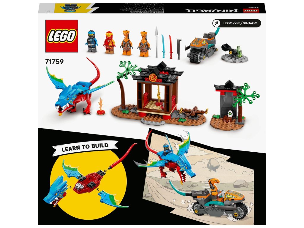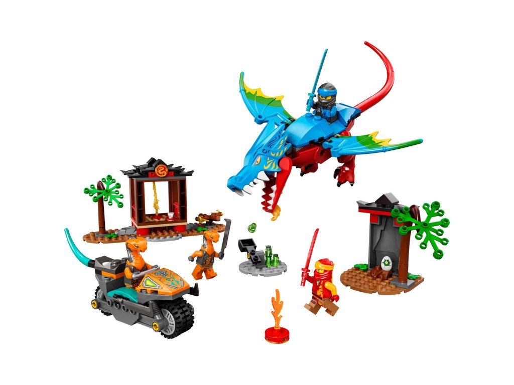 Stavebnice Dračí chrám nindžů (71759) pomůže dětem od 4 let s rozvojem stavitelských dovedností. Zaujme pohyblivým drakem, 2 chrámy nindžů, 2 pohyblivými stromy, dračím vejcem a 4 minifigurkami. Čekají na vás nindžové Kai a Nya a padouši kobří mechanik a prohnaný had.