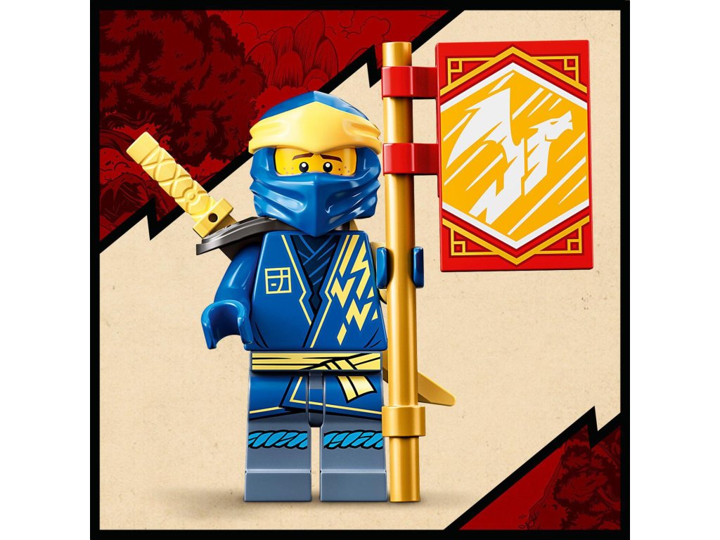 Součástí stavebnice jsou 2 minifigurky, které jsou zárukou dechberoucích střetů: Jay vyzbrojený nunčaky a mečem, zmijí letec s jetpackem a mečem. Novinka chystaná na leden 2022. A až děti porazí protivníky nindžů a dokončí svou misi, dostanou za odměnu sběratelský banner.