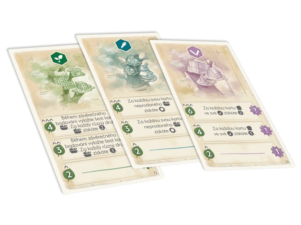 - Získávejte karty cechů z tržiště zaplacením jejich ceny a přidávejte si je na svou hráčskou desku.